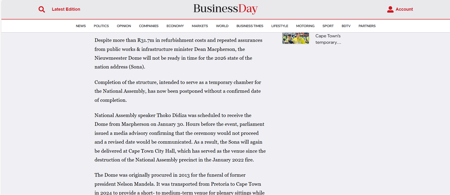 A parliamentary statement the following day invited media representatives to a ceremony on 30 January 2026 at which Public Works & Infrastructure Minister Dean Macpherson was expected to formally hand over the Nieuwmeester Dome to National Assembly Speaker Thoko Didiza – for use as a "temporary chamber" pending the completion of work on Parliament's fire-damaged buildings. There being no record of the event online (and in the absence of an official parliamentary statement) – we can only assume the handover was either postponed or cancelled. According to Business Day, "hours before the event, Parliament issued a media advisory confirming that the ceremony would not proceed and (that) a revised date would be communicated". Which would explain why a YouTube clip posted on Parliament's website that day entitled 'Handover of the Dome to NA Speaker, 30 January 2026' was unceremoniously removed.